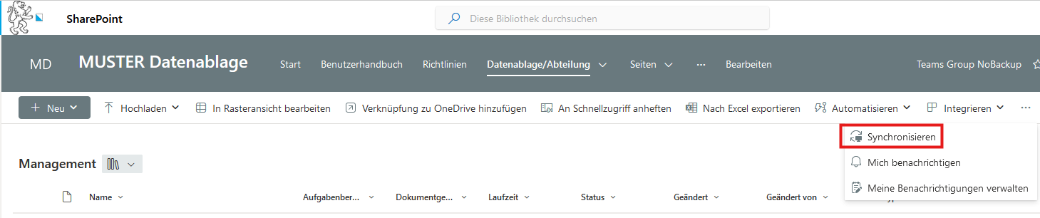 Die Dokumentbibliothek „Management“ aus einer SharePoint-Websitesammlung wird mit dem lokalen Gerät synchronisiert: