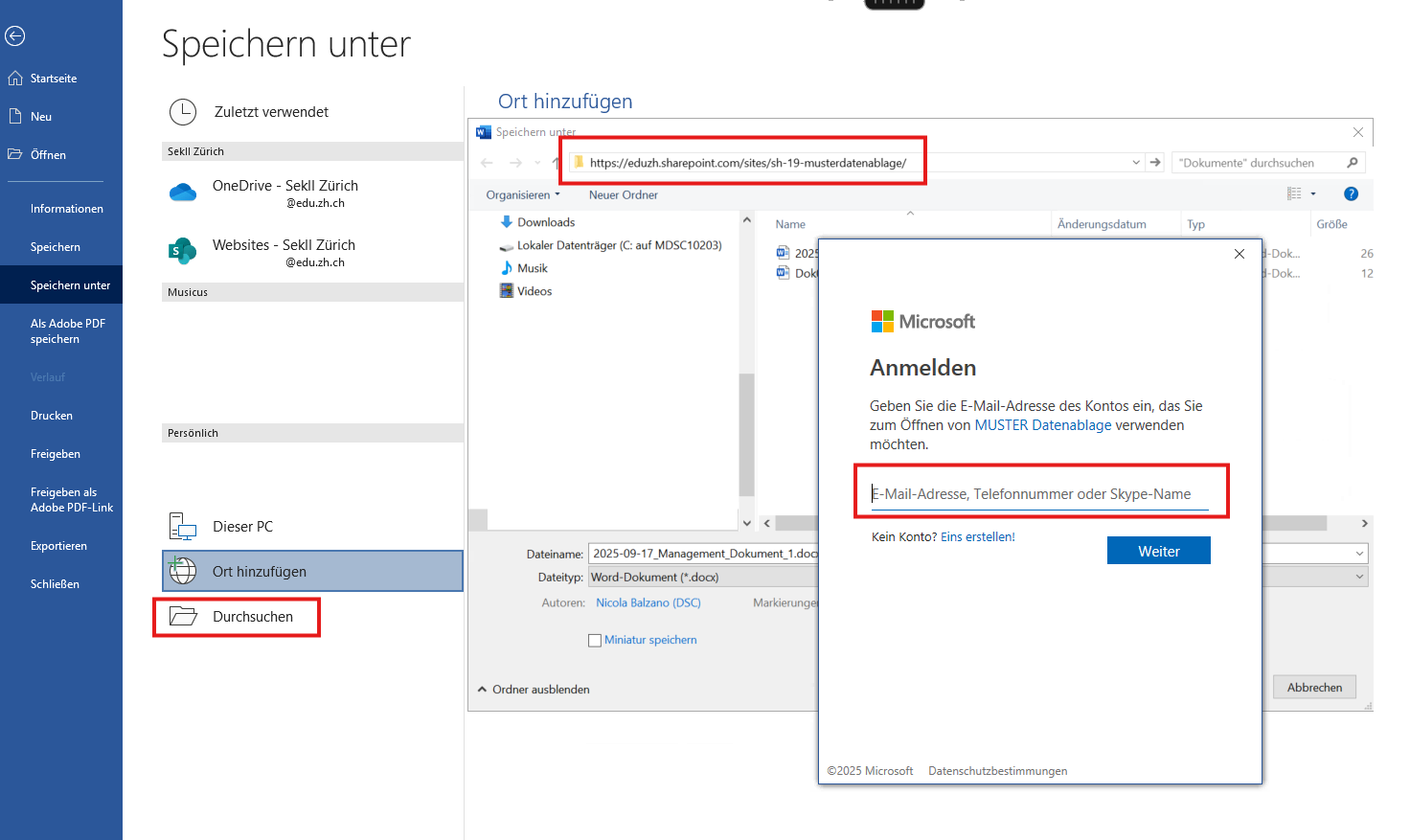 Hinweis: Falls die SharePoint-Datenablage «SekII Zürich» nicht erscheint, kann sie über den Pfad ausgewählt werden, unter dem OneDrive auf dem lokalen Gerät synchronisiert ist.