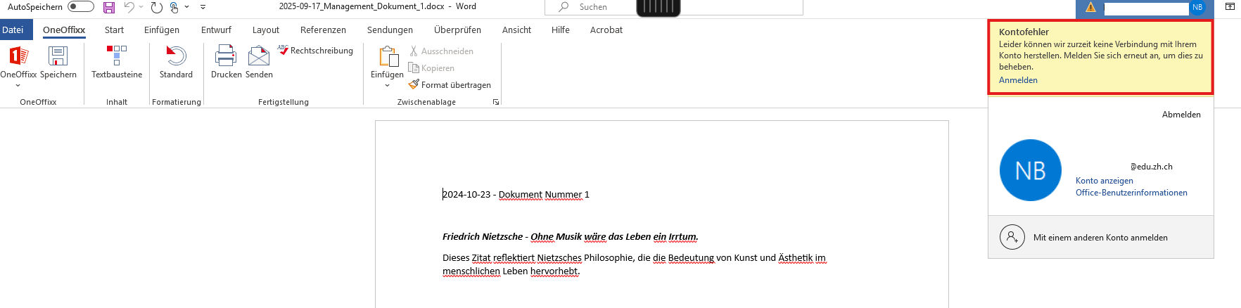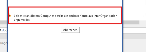 Sobald eine Office-Applikation geöffnet wird, muss darauf geachtet werden, dass man mit dem richtigen Konto angemeldet ist, das Zugriff auf die betreffende SharePoint-Datenablage hat. Manchmal erscheint das Konto zwar bereits als angemeldet, dennoch muss man sich erneut anmelden, bis die Fehlermeldung verschwindet: