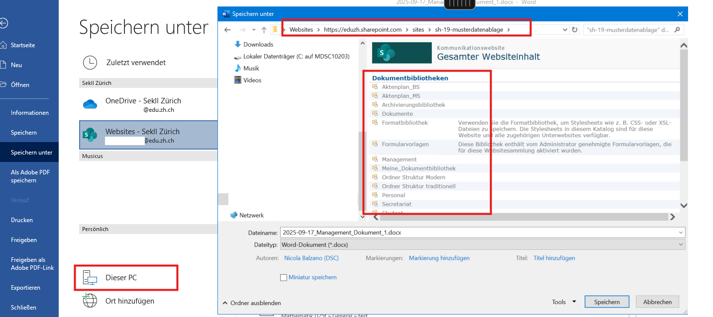 Jetzt kann man das Dokument in einem beliebigen Ordner der SharePoint-Datenablage speichern: