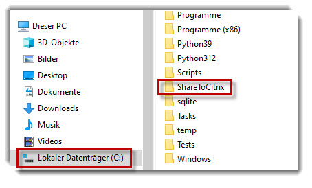 Um Dateien zwischen Citrix und dem lokalen Gerät zu übertragen, kann im C:-Laufwerk des lokalen Geräts ein Ordner erstellt werden (z. B. „ShareToCitrix“):